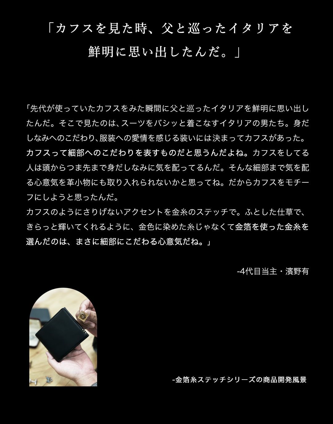 | 金箔のステッチが手元を飾る二つ折り財布 | 憧れを手にするコードバン長財布 | カフスがモチーフの“クラシコシリーズ”長財布 | ||