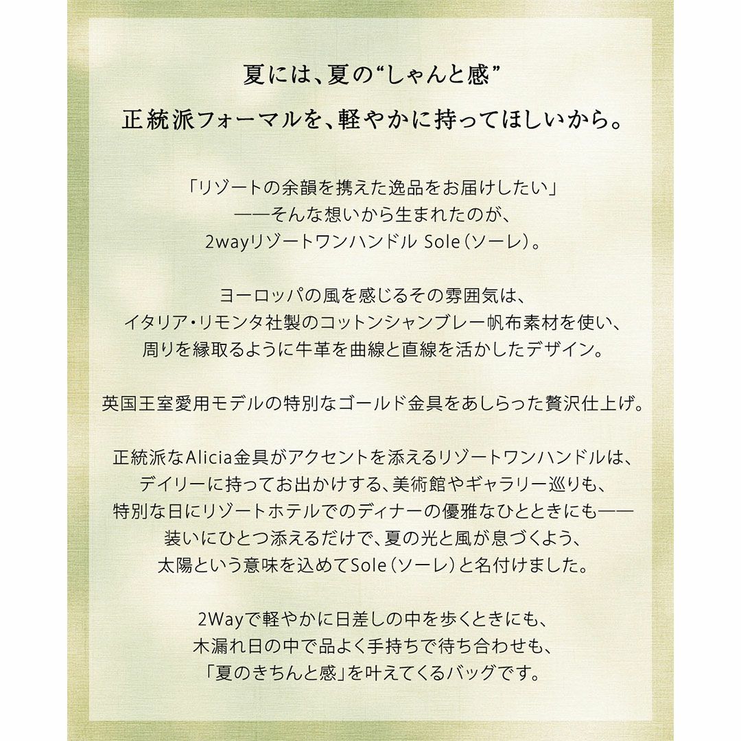 【傳濱野】王室愛用モデル金具で仕立てる、夏のリゾートワンハンドルAlicia Sole(アリシア ソーレ)