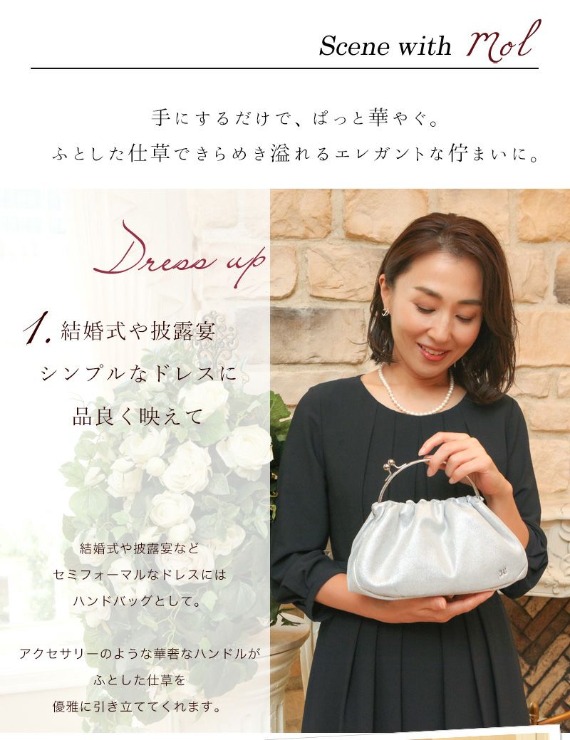 他の画像を見る 【傳濱野】人気シリーズから誕生!大切な人の門出にきらめきを添えるパーティーバッグ モル-シャインプラチナ 結婚式バッグ フォーマル 2way [formal] 販売価格 ¥ 39,600 税込