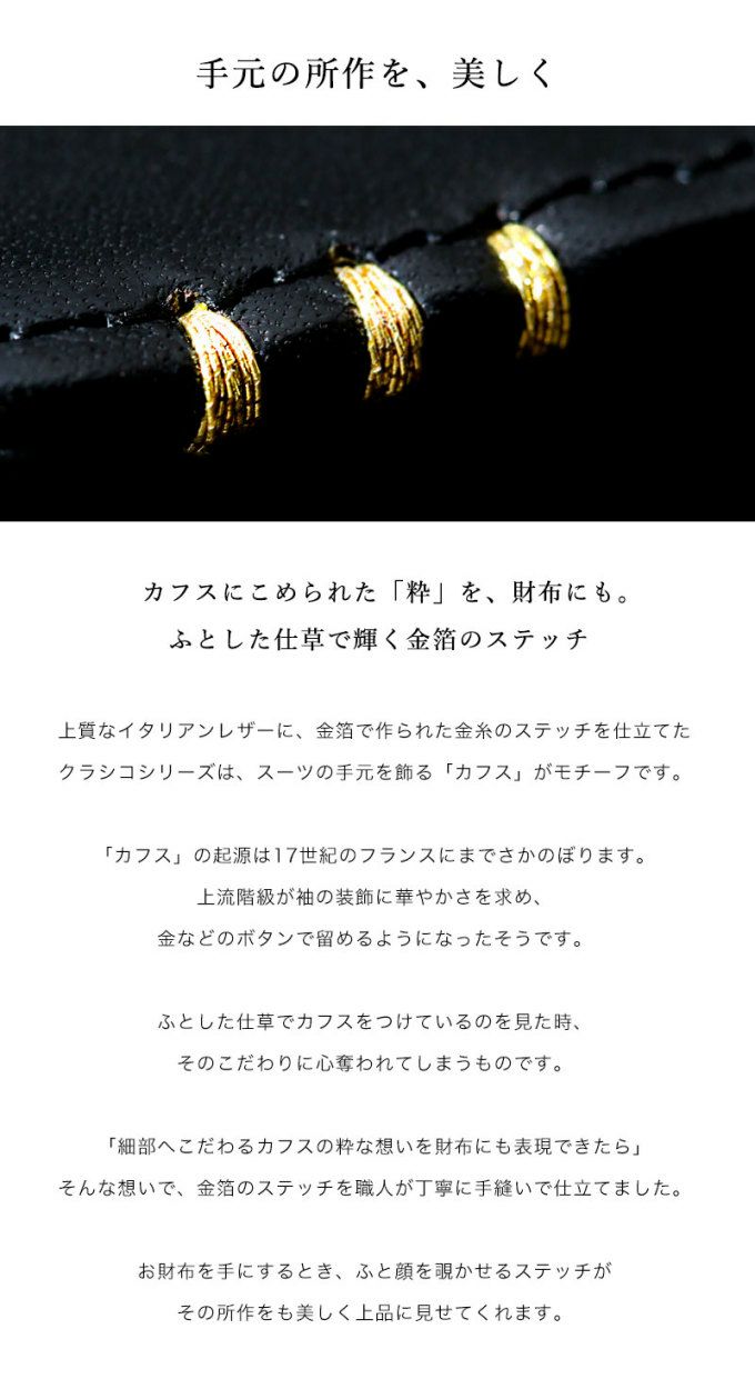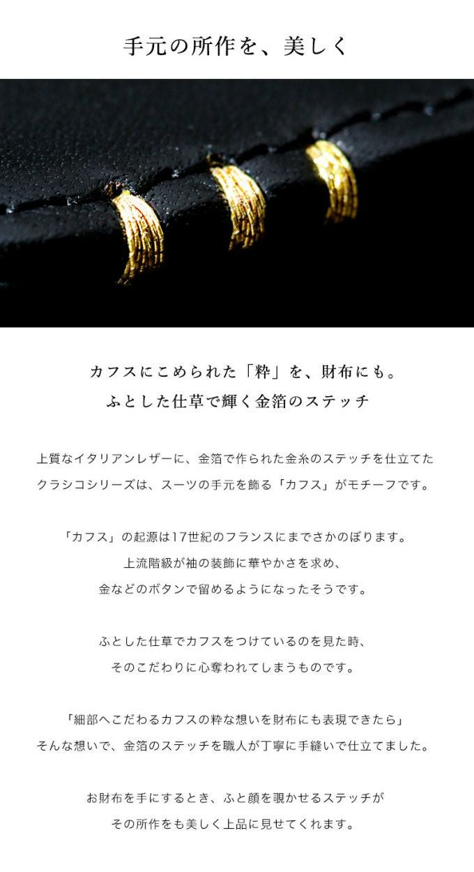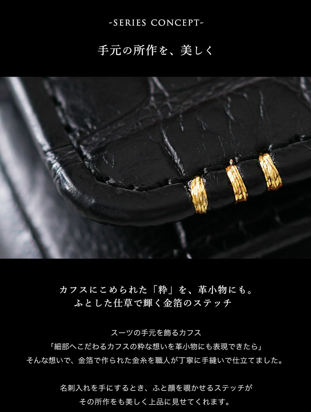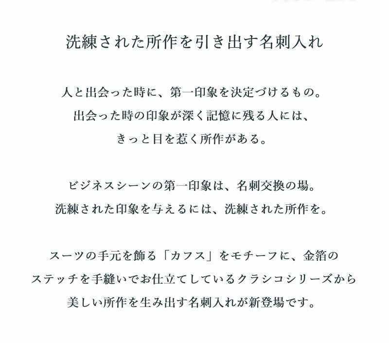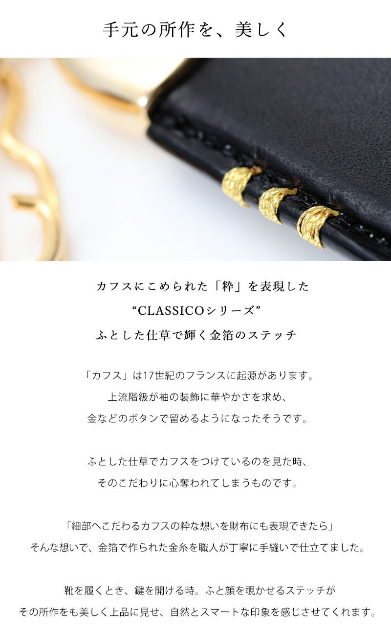| 金箔のステッチが手元を飾る二つ折り財布 | 憧れを手にするコードバン長財布 | カフスがモチーフの“クラシコシリーズ”長財布 | ||