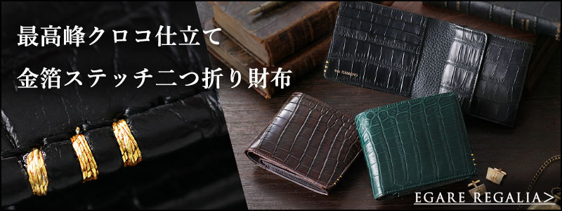 クロコダイルに金箔ステッチをあしらった二つ折り長財布