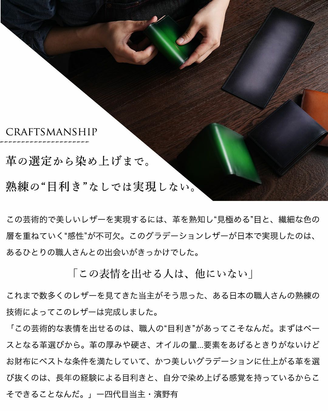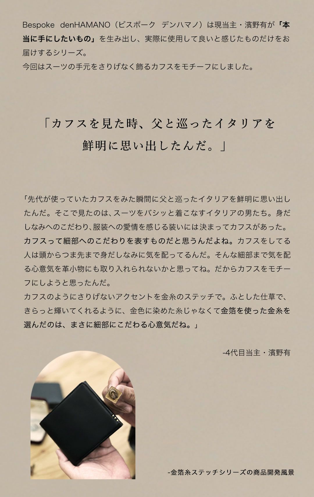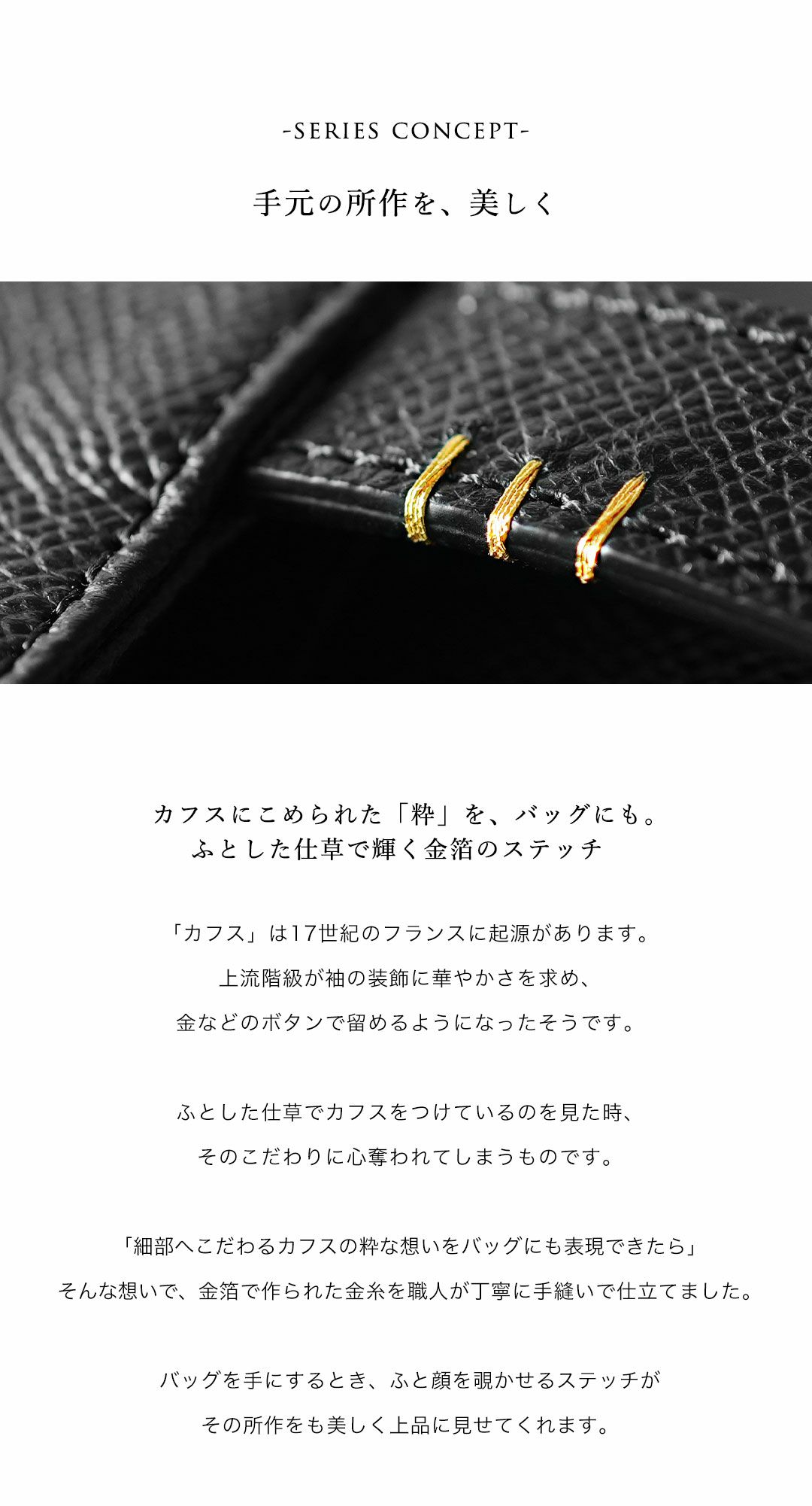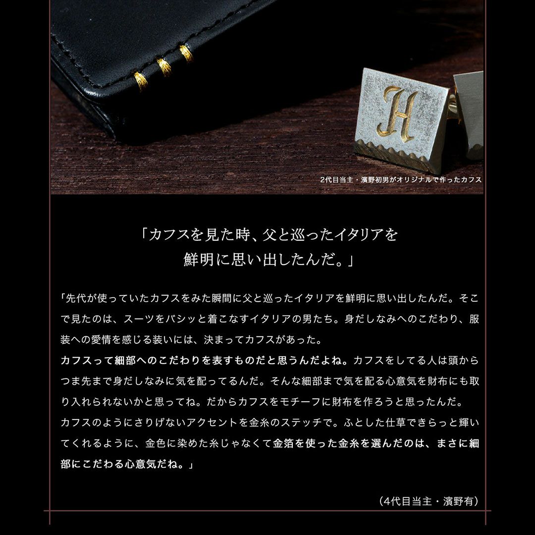 | 金箔のステッチが手元を飾る二つ折り財布 | 憧れを手にするコードバン長財布 | カフスがモチーフの“クラシコシリーズ”長財布 | ||