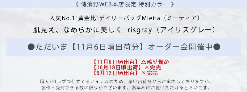 【傳濱野】≪WEB本店限定カラー≫皇室御用達 日本女性が輝く黄金比デイリーバッグMietia (ミーティア)特別色 Irisgray(アイリスグレー) お仕事 肩にかかる