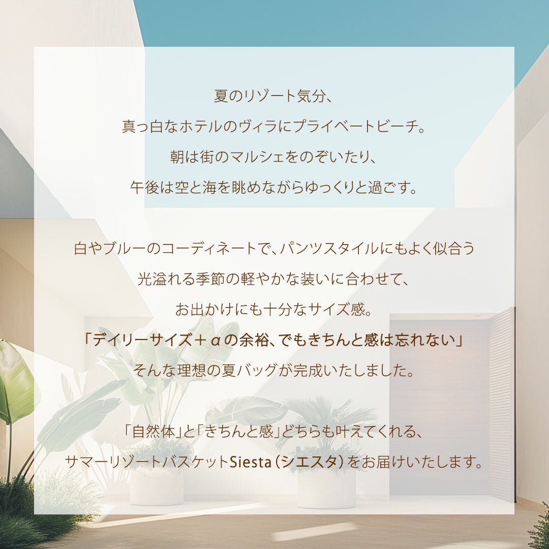 他の画像を見る 【傳濱野】《Summer》「自然体」と「きちんと感」を叶える濱野家のサマーリゾートバスケット nature baskettie Siesta(シエスタ) 販売価格 ¥ 40,700 税込 在庫切れ