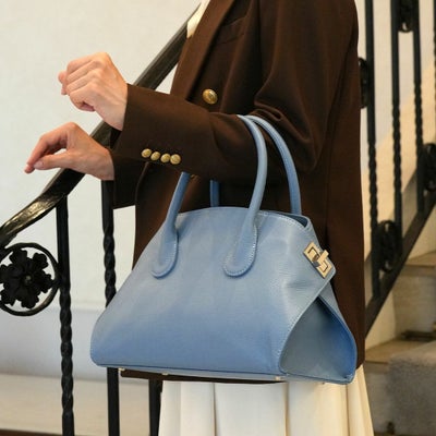 サイトで拝見して一目惚れでした。 何より色がきれいです。 今日のお出掛けも一緒です。 この美しい色に合わせて 私のセーターもブルーにしてバックの持ち手には ブルー系のスカーフを巻いておしゃれをしてあげました。 持ち姿も決まりますね! ただひとつだけ、 あえて言うとすれば 左右の四角い飾りを回さないと バックの口が開きにくいこと。 でも、この金具自体がおしゃれなんですけどね!