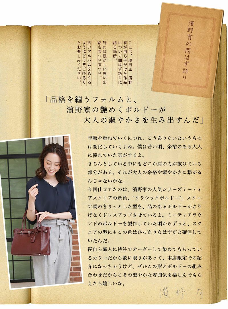他の画像を見る 【傳濱野】 ≪WEB本店限定カラー≫ 皇室御用達 日本女性が輝く黄金比デイリーバッグ Mietia Square(ミーティアスクエア) Classic Bordeaux(クラシックボルドー) お仕事 肩にかかる 販売価格 ¥ 47,300 税込
